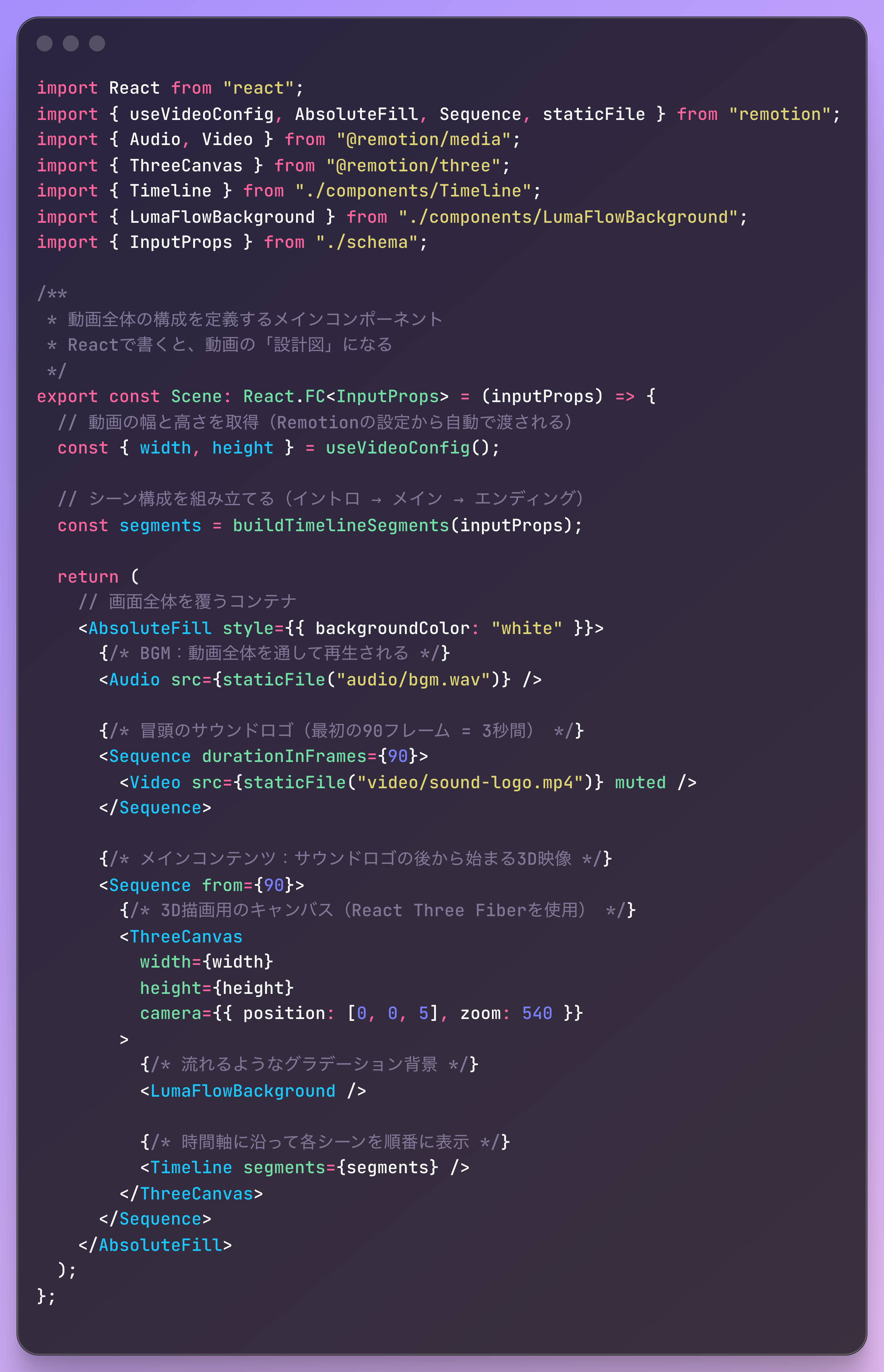このツールを使うことで、↓のようなコード(※簡略化したイメージ)を書くことで、「動画をコードで制作」することができます。